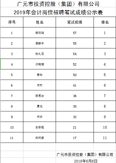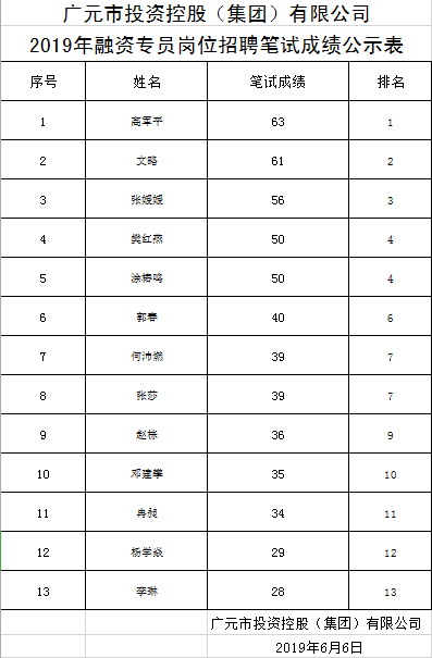 廣元市投資控股(集團)有限公司關于公開招聘工作人員的筆試成績公示表