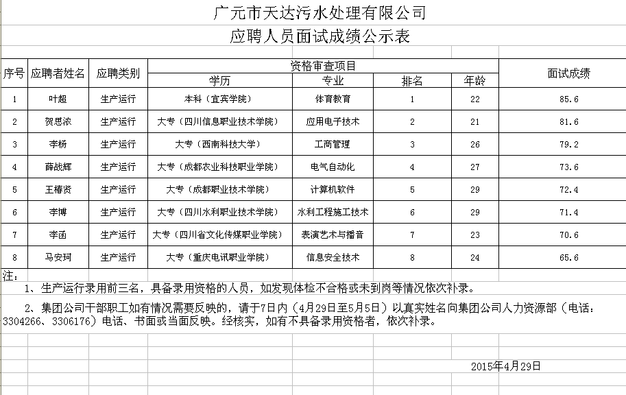 廣元市天達(dá)污水處理有限公司應(yīng)聘人員面試成績(jī)公示表